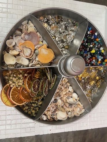 We offer a type of candle wax that is free from lead and other harmful material and our dyes and charms are specifically made for candle making. We offer a wide range of charms, glass beads, seashells and dried flower and fruit to name a few to place on top of your custom candle or place on the inside!